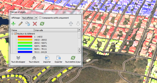 (Ajouter un nouveau thème). Par exemple, pour créer un thème qui compare la hauteur des bâtiments, sélectionnez la classe d'objets Bâtiments, puis sélectionnez la propriété Roof Height (Hauteur du toit). Les valeurs minimale et maximale pour cette propriété s'affichent. Vous ne pouvez pas les modifier.