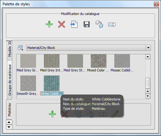 Ajoutez un échantillon de texture ou de couleur comme style de matériau. Lorsqu'il est appliqué, le matériau est affiché en mosaïque sur la surface de l'objet auquel il est appliquée.