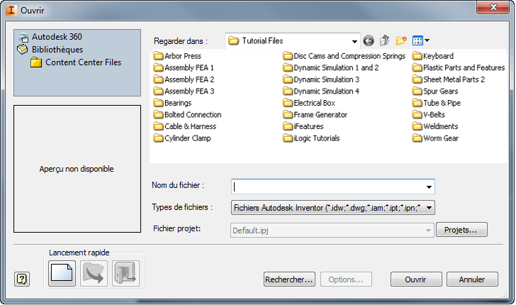 Si vous survolez l'entrée de l'espace de travail dans la boîte de dialogue Ouvrir, l'info-bulle indique que le dossier Tutorial Files est défini en tant qu'espace de travail. En plus, toutes les bibliothèques et sous-dossiers que vous définissez seront aussi accessibles ici.
