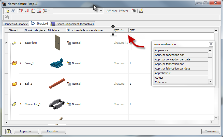La valeur Apparence du modèle est ajoutée en tant que propriété sélectionnable. Vous pouvez ajouter la propriété Apparence à une nomenclature ou une liste de pièces.