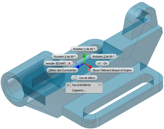 Une nouvelle option d'application d'ensemble permet de spécifier s'il est nécessaire de bloquer le premier composant placé à l'origine. Cette nouvelle option est désactivée par défaut. Utilisez le menu contextuel pour bloquer un composant à l'origine. Le menu contient de nouvelles options permettant de faire pivoter les composants par incréments de 90 degrés autour de l'axe X, Y ou Z, avant de les placer dans l'ensemble.