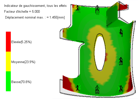 Ce résultat montre la magnitude relative du gauchissement (modification hors plan de la forme) pour les pièces. Les zones vertes sont inférieures à 80 % et les zones rouges représentent au moins 120 % du déplacement nominal max. La valeur par défaut pour le déplacement nominal maximal est égale à la moitié de l'épaisseur moyenne de la pièce. Le déplacement est exagéré de cinq fois afin qu'il soit plus visible.