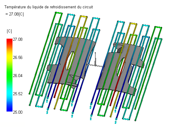 Les résultats indiquent le nombre de Reynolds produit à l'aide du débit d'entrée. En général, une cible de nombre de Reynolds de 10 000 est souhaitable. Dans ce cas, le nombre de Reynolds est bien au-dessus suggérant que le débit pourrait être réduit. Cependant, si le débit est réduit, la température du liquide de refroidissement augmente dans les circuits. Si vous souhaitez réduire le débit, les circuits doit être divisés pour réduire leur longueur.