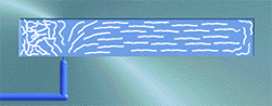 Le surcompactage se produit lorsque les trajectoires d'écoulement les plus faciles, à savoir les plus courtes ou les plus épaisses, se remplissent en premier. Lorsque ces trajectoires d'écoulement sont remplies, elles restent sous pression au moment où une quantité supplémentaire de plastique est injectée dans l'empreinte pour remplir les autres trajectoires d'écoulement. Cette pression pousse plus de matière dans la trajectoire d'écoulement déjà remplie, donnant à celle-ci une densité plus élevée et un retrait plus faible que d'autres régions. La trajectoire d'écoulement surcompactée se solidifie sous pression, gelant ainsi les contraintes. Dans le schéma suivant, les lignes blanches représentent les molécules du polymère. Notez que les trajectoires d'écoulement ne sont pas équilibrées et qu'un surcompactage aura lieu dans la partie gauche de la pièce.