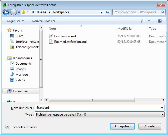 3. Dans la boîte de dialogue Enregistrer l'espace de travail actuel, donnez un nom au nouvel espace de travail. Vous pouvez également sélectionner le nom d'un espace de travail existant afin de le remplacer par votre nouvelle configuration.
