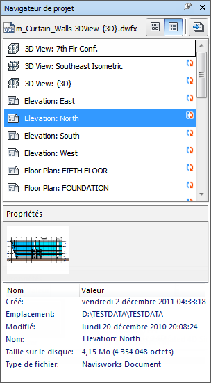 La palette des feuilles/modèles répertorie l'ensemble des feuilles et des modèles contenus dans le fichier de plusieurs feuilles. Le libellé en haut de la palette indique le fichier actuellement ouvert dans Autodesk Navisworks. La feuille/le modèle peut être représenté sous forme de liste ou de miniature. Par défaut, l'ordre d'affichage est le même que celui du fichier d'origine. La feuille/le modèle actuellement sélectionné est indiqué par un arrière-plan ombré, tandis que la feuille/le modèle actuellement ouvert dans la vue de scène est indiqué par une bordure graphique noire. Lorsque vous ouvrez un fichier de plusieurs feuilles, certains modèles/feuilles n'ont peut-être pas été préparés en vue d'une utilisation dans Autodesk Navisworks. Les feuilles/modèles qui nécessitent une préparation sont indiqués par l'icône Préparer
