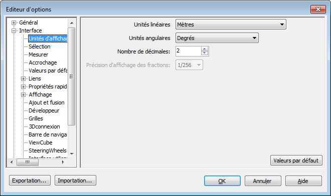 Editeur d'options. Les options sont regroupées et figurent sous la forme d'une arborescence, ce qui facilite leur localisation et leur modification.