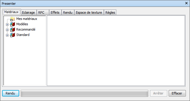 La fenêtre ancrable Presenter permet de configurer les matériaux, les éclairages et les effets de votre scène pour obtenir un rendu encore plus réaliste. Vous pouvez également l'utiliser pour modifier des matériaux prédéfinis et les associer aux éléments de la scène, ajouter des éclairages à la scène ou encore définir des règles précises en vue d'appliquer les matériaux à d'autres fichiers du même projet possédant les mêmes paramètres. Pensez à enregistrer, dans un fichier NWF, les matériaux et éclairages que vous définissez et appliquez à un modèle, de manière à conserver ces données précieuses au fur et à mesure de la mise à jour du modèle.