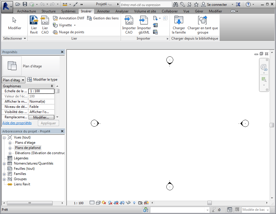 La zone de dessin de la fenêtre Revit affiche les vues (ainsi que les feuilles et les nomenclatures) du projet en cours. A chaque fois que vous ouvrez une vue dans un projet, par défaut la vue s'affiche dans la zone de dessin au-dessus des autres vues. Les autres vues restent ouvertes, mais elles se trouvent sous la vue active. Organisez les vues du projet en fonction de votre méthode de travail à l'aide des outils de l'onglet Vuegroupe de fonctions Fenêtres.