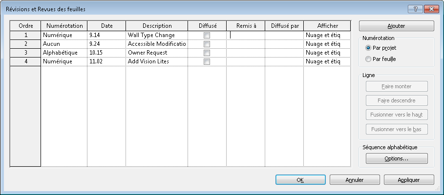 Revit offre une grande souplesse en termes d'affichage de l'ordre des révisions dans un projet. Pour effectuer le suivi des révisions, vous disposez des schémas de numérotation suivants :