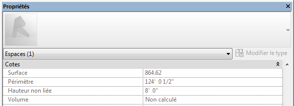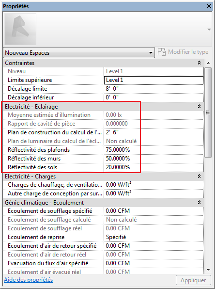 Le RCR est calculé en fonction de la hauteur de cavité de pièce (RCH) et du plan de construction du calcul de l'éclairage, qui est une propriété de chaque occurrence d'espace.