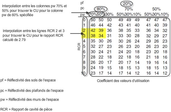 Le CU est calculé en fonction des propriétés de réflectivité (plafond, mur et sol), ainsi que du rapport de cavité de pièce (RCR) de l'espace.