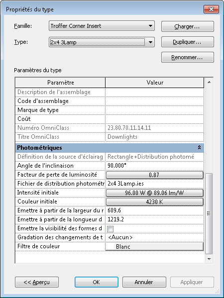 L'intensité initiale et le facteur de perte de luminosité sont des propriétés de type de chaque type de luminaire. Ces propriétés sont accessibles dans la boîte de dialogue Propriétés du type d'un luminaire.