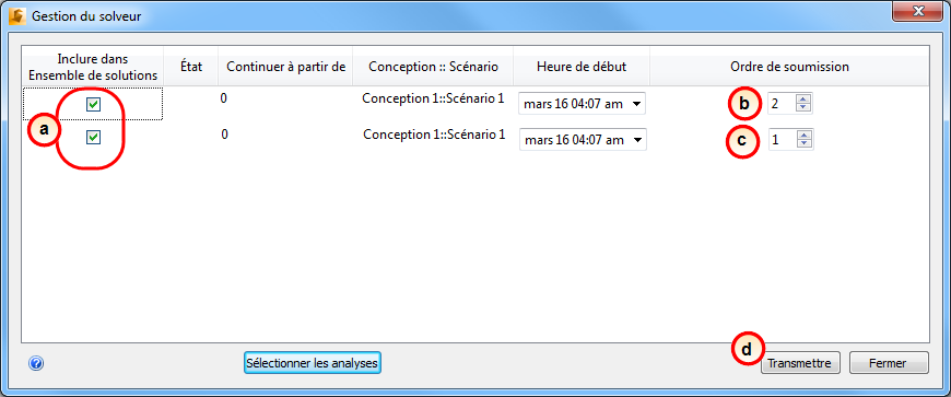 - La barre Etude de conception utilise des icônes spéciales pour afficher l'état de chaque scénario. Notez que l'icône "Exécution" apparaît à côté du nom de scénario d'hiver pour signaler que ce scénario est en cours d'exécution. Notez que l'icône "En fil d'attente..." apparaît à côté du nom de scénario d'été pour signaler que ce scénario ce trouve dans la file d'attente et sera exécuté le suivant.