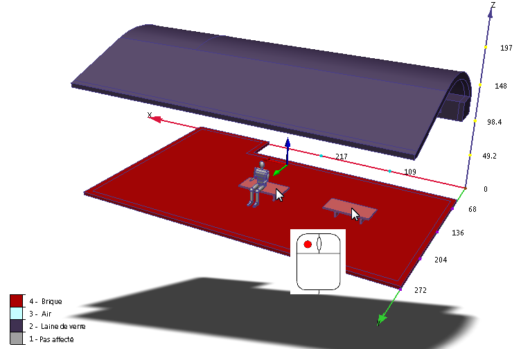 Remarque : Les pièces Mur et Air doivent toujours être masquées, ce qui facilite l'accès aux bancs. Si ce n'est pas le cas, il vous suffit de les masquer en cliquant avec la touche centrale. De ce fait, il est plus facile de sélectionner les bancs.