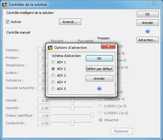 Dans la boîte de dialogue Résoudre, cliquez sur Contrôle de la solution puis sur Advection. Dans la boîte de dialogue Options d'advection, sélectionnez ADV2 . Cliquez sur OK , puis cliquez une nouvelle fois sur OK dans la boîte de dialogue Contrôles de la solution.