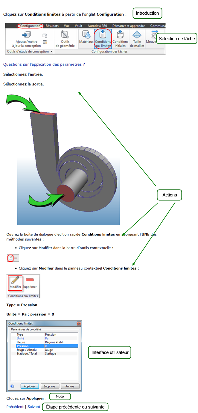 Pour utiliser les exemples, une méthode pratique consiste à positionner les fenêtres du navigateur et d'Autodesk Simulation CFD l'une à côté de l'autre. Les étapes utilisent normalement une présentation étroite compatible avec une largeur de navigateur réduite.