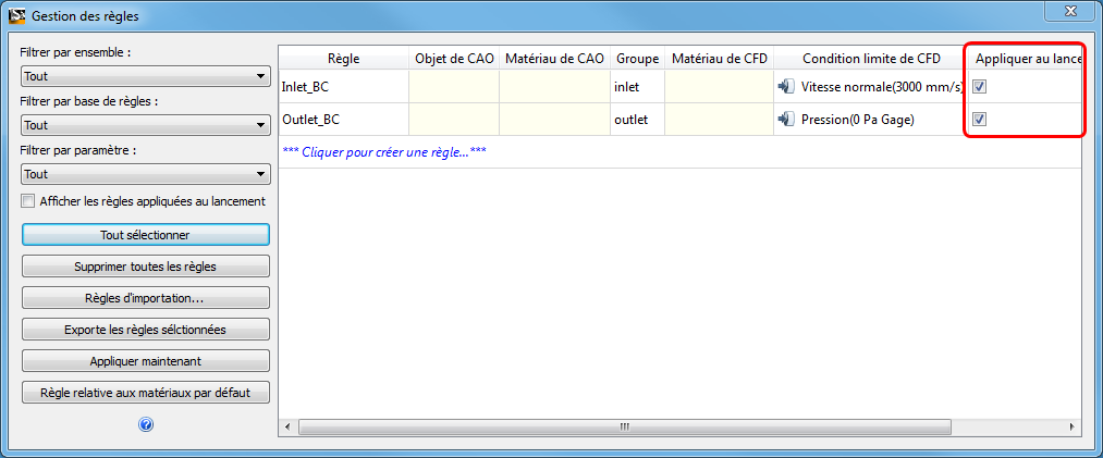 Les conditions limites pour l'étude de conception seront affectées automatiquement sur la base des règles créées au cours de cette étape.