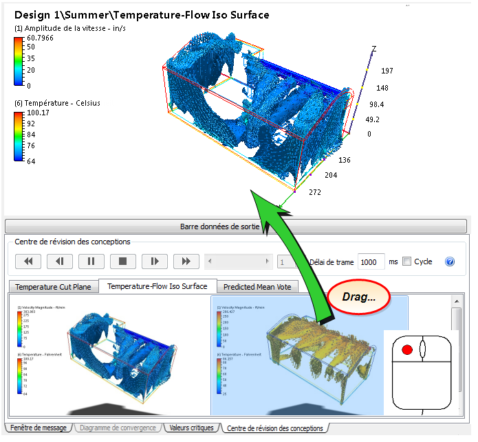 Dans l'étape précédente, vous avons regardé la température au milieu du hall et nous avons observé des différences importantes entre les scénarios d'hiver et d'été. Dans cette étape, nous allons utiliser l'image récapitulative d'une isosurface pour mieux comprendre l'interaction entre l'écoulement et la température.