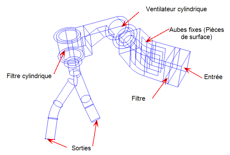 Dans ce réseau de gaines HVAC, l'air s'écoule à travers plusieurs filtres et une soufflante centrifuge, puis sort par deux tubes de distribution.
