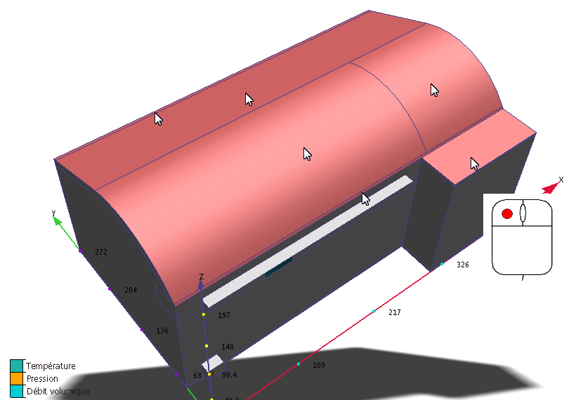 15. Pour vérifier que la condition aux limites du coefficient de transmission superficielle est correctement appliquée à la surface extérieure, vérifiez la barre Etude de conception et la bande de couleur sur les surfaces :