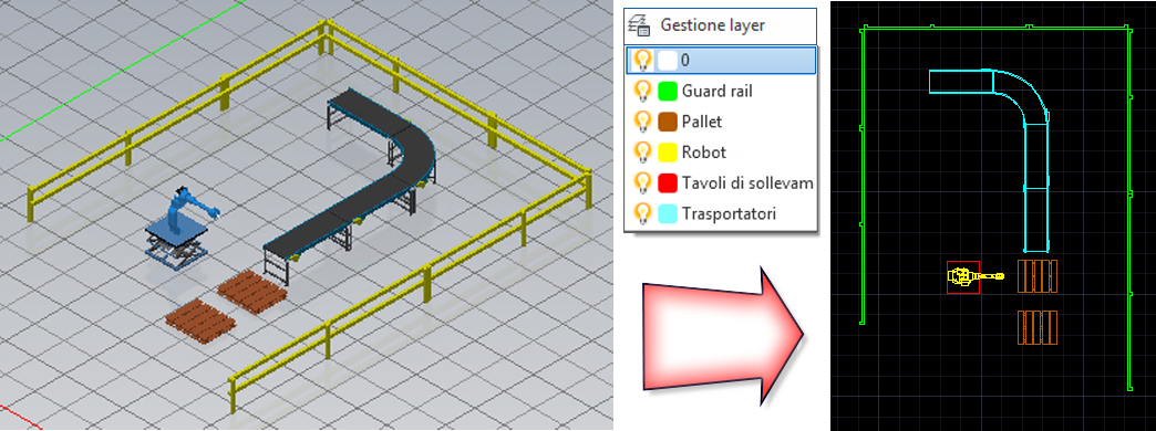 Una volta creato, il layer viene impostato come corrente prima di posizionare un asset sul pavimento della fabbrica. In questo modo si garantisce che l'asset venga posizionato nel layer appropriato, con il colore assegnato allo specifico layer, ma è possibile spostare facilmente un asset posizionato da un layer all'altro in qualsiasi momento. I colori dei layer assegnati agli asset 3D posizionati nel layout non vengono visualizzati in Inventor Factory. Tuttavia, dopo l'esecuzione del comando Sincronizza AutoCAD, ciascuno degli asset 2D viene visualizzato in AutoCAD Factory con i colori dei layer specificati. Tenere presente che solo i layer che contengono asset 3D posizionati nel layout di Inventor Factory vengono aggiunti al disegno di AutoCAD Factory.
