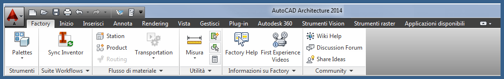 L'interfaccia utente delle Factory Design Utilities è disponibile nella scheda Factory ed è costituita da gruppi denominati Strumenti, Suite Workflows, Flusso di materiale, Utilità, Informazioni su Factory e Community. L'ambiente di lavoro di default di Factory è costituito da un assortimento di gruppi di Factory e di AutoCAD standard.