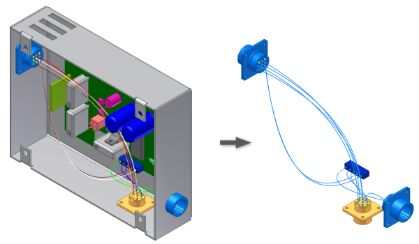 Un uso comune del comando Importa dati cablaggio è l'interazione con AutoCAD® Electrical. Un comando di AutoCAD Electrical consente di esportare dati specificamente per Cavi e cablaggi. In tal modo i progettisti elettrici possono comunicare con semplicità le informazioni di connessione ai progettisti meccanici. Il progettista meccanico può quindi definire il percorso dei wire nel prototipo digitale.