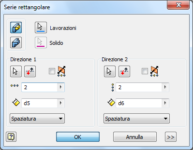 Usare la freccia di inversione della direzione per invertire la direzione. Impostare il numero di ricorrenze su 2 ed evidenziare il testo nel campo relativo alla spaziatura di quote. Con il testo evidenziato, selezionare la quota dello schizzo orizzontale in modo da usare il valore della quota per la spaziatura. Selezionare la freccia Direzione 2 e scegliere un modello verticale o uno spigolo dello schizzo. Impostare il numero di ricorrenze su 2 ed evidenziare il testo nel campo relativo alle quote. Selezionare la quota di riferimento verticale per usare il valore della quota.