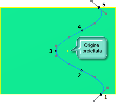 Creare una spline con cinque punti fissati, come mostrato nell'immagine seguente. Fare doppio clic sull'ultimo punto per creare la spline. Non è necessario che le maniglie della spline corrispondano all'immagine.