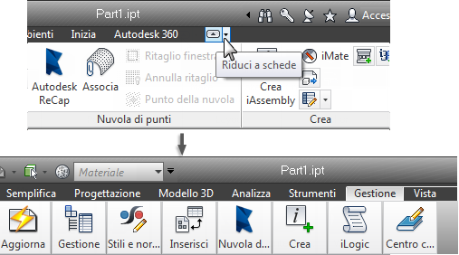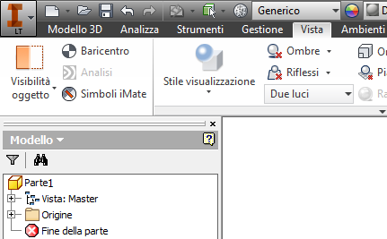 Questo comando nasconde il browser ed espande l'area grafica fino all'intera finestra dell'applicazione. Se precedentemente ingranditi, i gruppi di schede vengono ridotti al minimo. Il comando consente inoltre di ampliare al massimo la finestra di Autodesk Inventor LT su schermo.