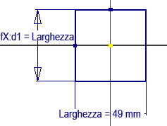 - Nella finestra di dialogo Modifica quota, immettere l'equazione Width=49mm per definire una variabile denominata Larghezza con un valore iniziale di 49 mm.