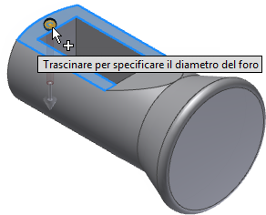 - Osservare attentamente il punto selezionato nella faccia superiore. L'anello manipolatore intorno al centro del foro rappresenta il diametro del foro. Fare clic sull'anello con il mouse: l'anello diventerà di colore oro. Tentare di trascinare l'anello manipolatore dorato per aumentare o diminuire il diametro del foro.