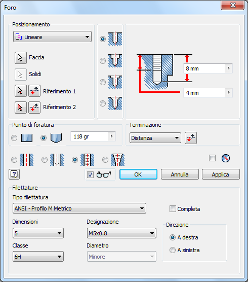 - Fare clic sul pulsante OK per chiudere la finestra di dialogo, creare il foro filettato e terminare il comando.