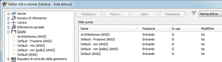La norma attiva definisce un gruppo di stili di annotazione utilizzati nel disegno. Inoltre, contiene le impostazioni per viste, testo, tratteggi e valori di default degli oggetti.