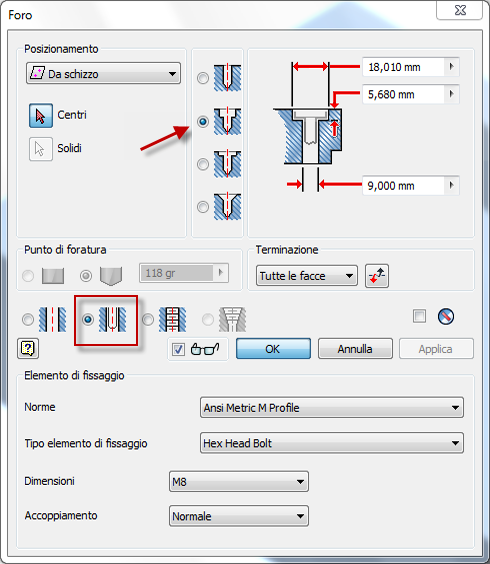 I passaggi successivi consentono di creare da una tabella di controllo dinamico un foro con gioco lamato per un bullone a testa esagonale.