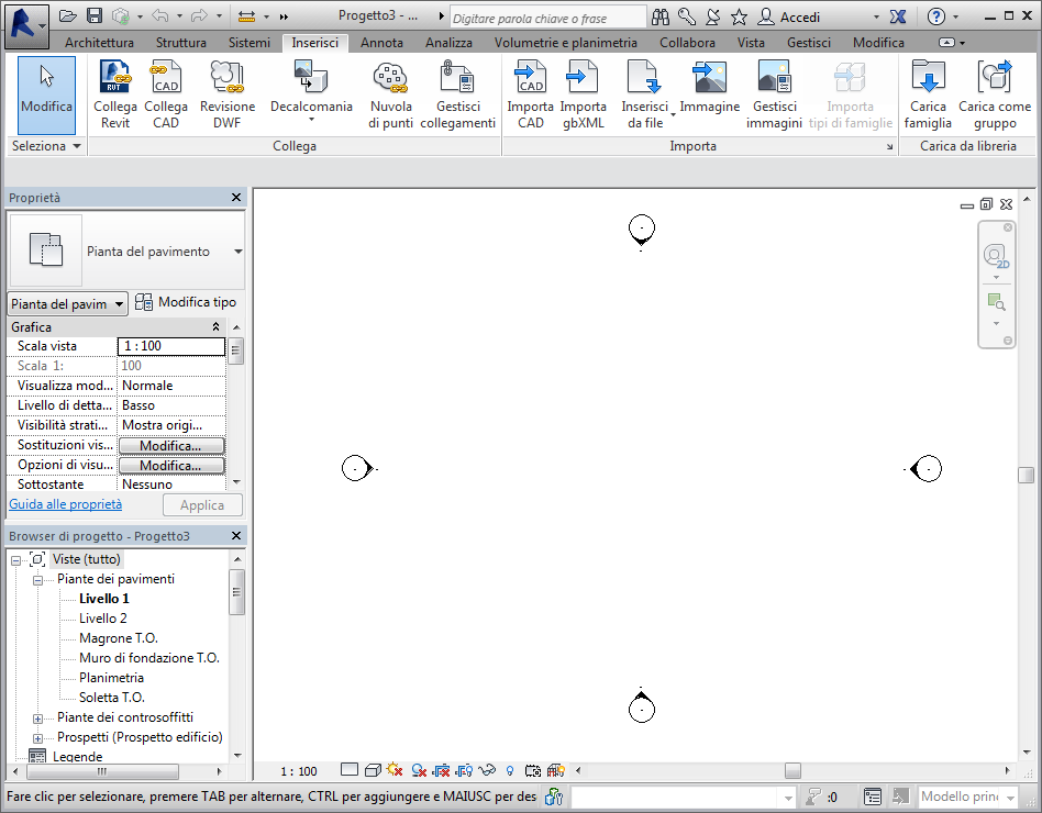 Nell'area di disegno della finestra di Revit vengono visualizzati viste, tavole e abachi del progetto corrente. Ogni volta che si apre una vista in un progetto, per default la vista viene sovrapposta alle altre viste aperte nell'area di disegno. Le altre viste restano aperte, ma si trovano al di sotto di quella corrente. Utilizzare gli strumenti della scheda Vistagruppo Finestre per disporre le viste di progetto in base alle esigenze di lavoro personali.