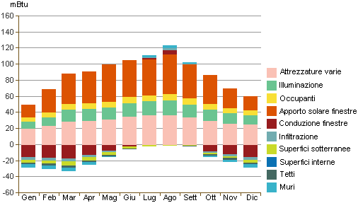Esempio: nel grafico riportato sopra, i carichi di raffreddamento maggiori sono richiesti in agosto a causa dell'apporto solare o dell'incremento di calore solare radiante attraverso le finestre. A confronto, gli incrementi di calore attraverso i muri sono trascurabili. Pertanto, è consigliabile ridurre l'indice di riscaldamento alla radiazione solare delle finestre prima di investire nel miglioramento dell'isolamento dei muri.
