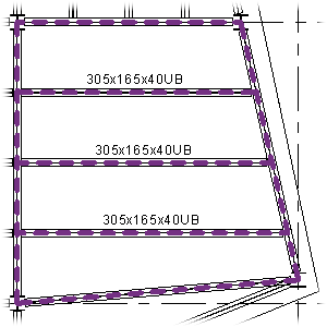 Le etichette del telaio sono etichette del telaio strutturale che, per default, vengono allineate parallelamente alla parte superiore centrale delle travi create nel sistema. È possibile modificare le posizioni di tali etichette utilizzando lo strumento di annotazione delle travi. Vedere Strumento Annotazioni trave.
