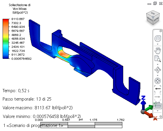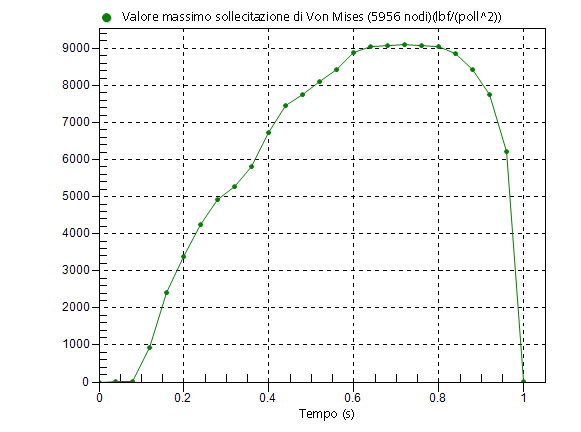 Esegui simulazione. I valori dell'intensità dello spostamento vengono visualizzati per default. Ora saranno visualizzati e quindi animati i risultati della sollecitazione di Von Mises. Sarà anche stampata la cronologia temporale della sollecitazione di Von Mises massima.
