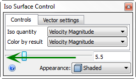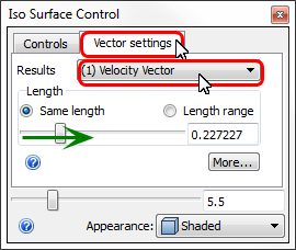 6. Per visualizzare i vettori, fare clic sulla scheda Impostazioni vettore. Selezionare Vettore di velocità dal menu Risultati. Trascinare il dispositivo di scorrimento Lunghezza verso destra in modo da poter vedere meglio i vettori.