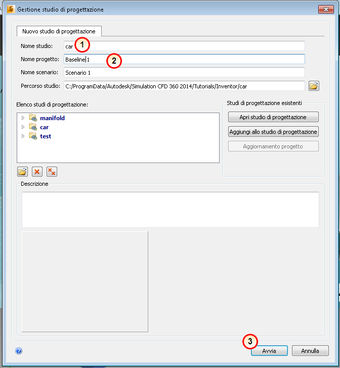 3. In the Design Study Manager, assign names to the design study, design, and scenario