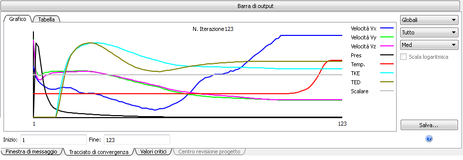 I fenomeni di flusso come il ricircolo causano una naturale fluttuazione di alcune grandezze. È possibile che le curve non si appiattiscano e che la convergenza automatica non venga raggiunta. Come determinare la convergenza manualmente: