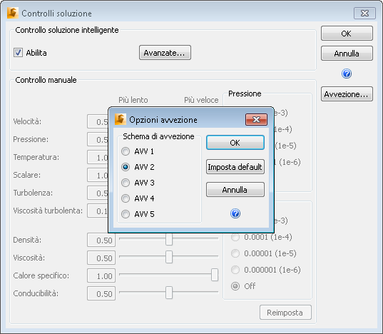 Nella finestra di dialogo Risolvi, fare clic su Controllo soluzione, quindi fare clic su Avvezione. Nella finestra di dialogo Opzioni avvezione, selezionare Avvezione ADV2. Fare clic su OK, quindi su OK nella finestra di dialogo Controlli soluzione.