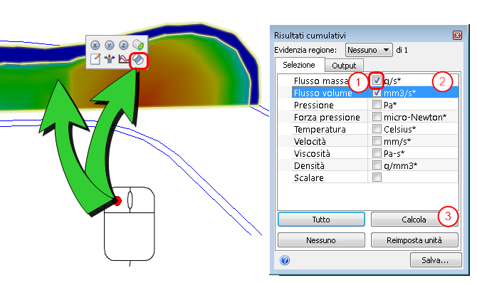 Oltre a un feedback visivo del comportamento di flusso e temperatura, il piano dei risultati consente anche di accedere ai risultati quantitativi. Esistono tre modi per misurare i risultati in tempo reale: