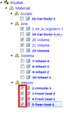 7. To shade the car body, check the box beside the Car Body part under the Steel branch of the Results > Material branch. Right click on the selected part name, and select Shaded.
