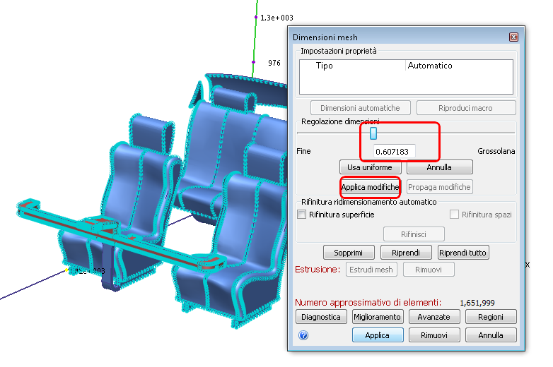 13. Select the cabin air part. In the Mesh Sizes dialog, drag the Size adjustment slider to approximately 2 (or type 2 in the field and press the Enter key). Click Apply changes.