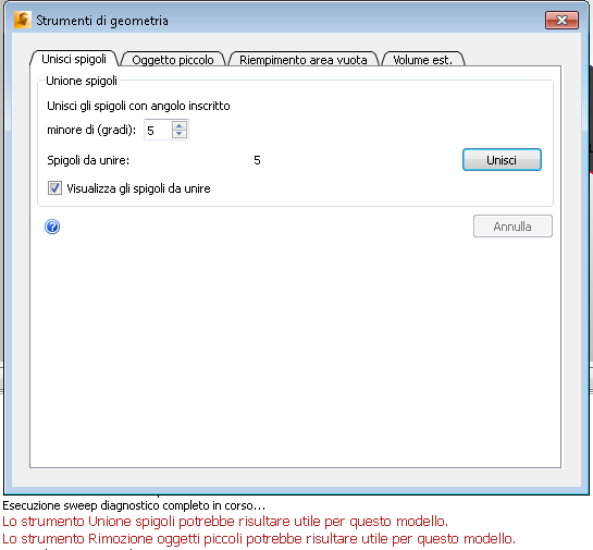 Rimozione oggetti piccoli è uno strumento di correzione della geometria, non di eliminazione parte. È preferibile sopprimere le parti dal modello usando lo strumento CAD. Lo strumento consente di rimuovere superfici e bordi troppo piccoli per essere visibili.