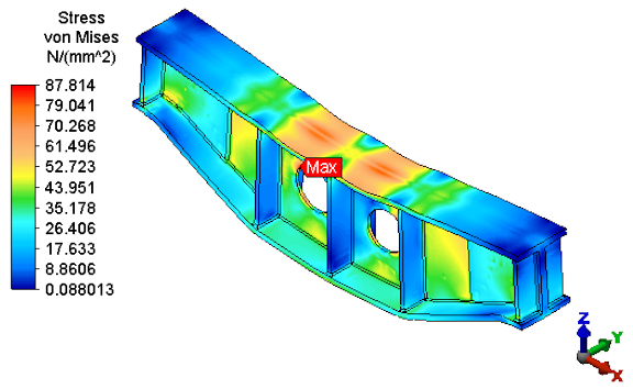 Run Simulation. After solid meshing, the analysis proceeds and the model displays in the Results environment. The maximum non Mises stress is now approximately 88 N/mm2, which is below the allowable stress of 90 N/mm2. The stress results appear as shown in the following image.