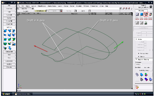 These particular surfaces will be used as guides to build what will become the main body of the watch or 'Master' surface. They were created using the Draft tool (one of my favorite tools) in each the X and Y directions. Notice how the isoparms of the Draft surfaces match the isoparms of the reference revolve.